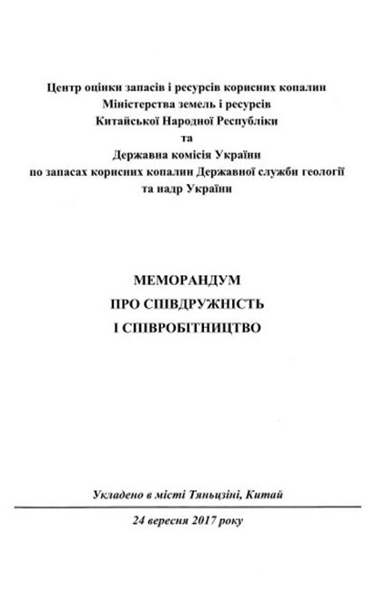 | Меморандум про співдружність і співробітництво між Центром оцінки запасів і ресурсів корисних копалин Міністерства земель і ресурсів КНР та Державною комісією України по запасах корисних |